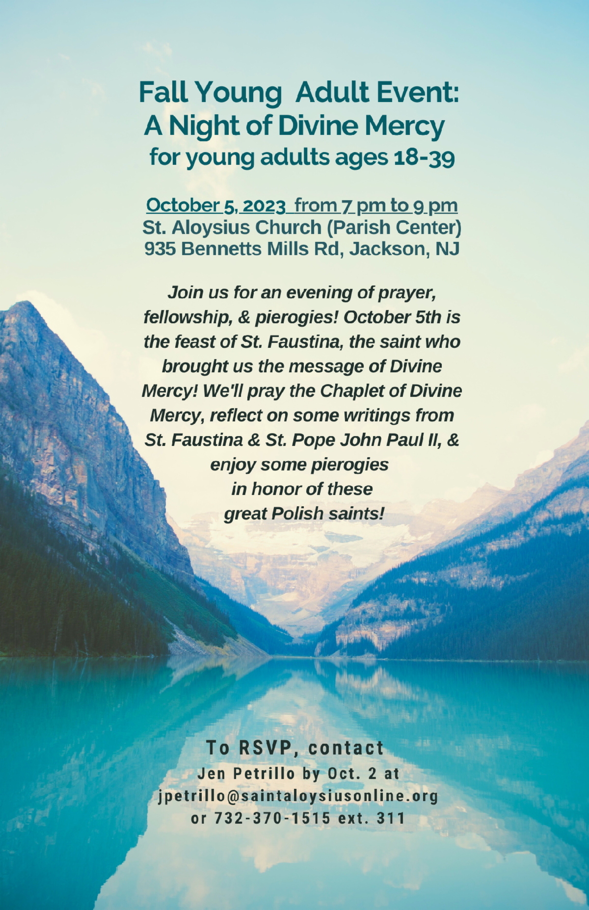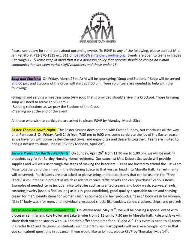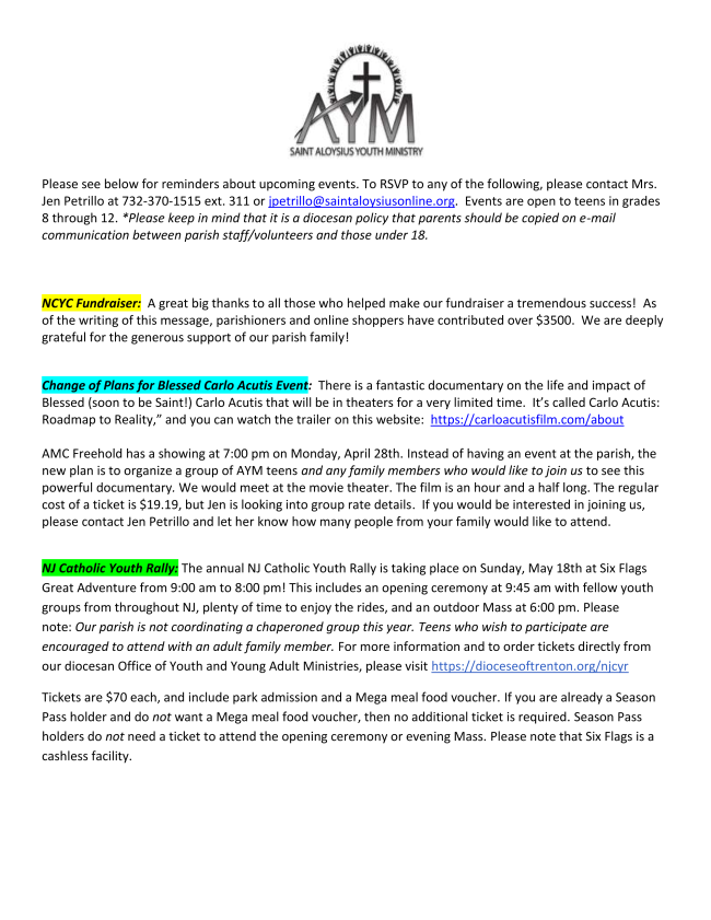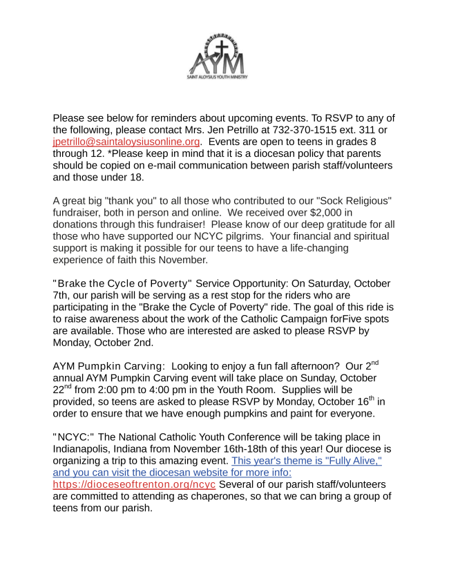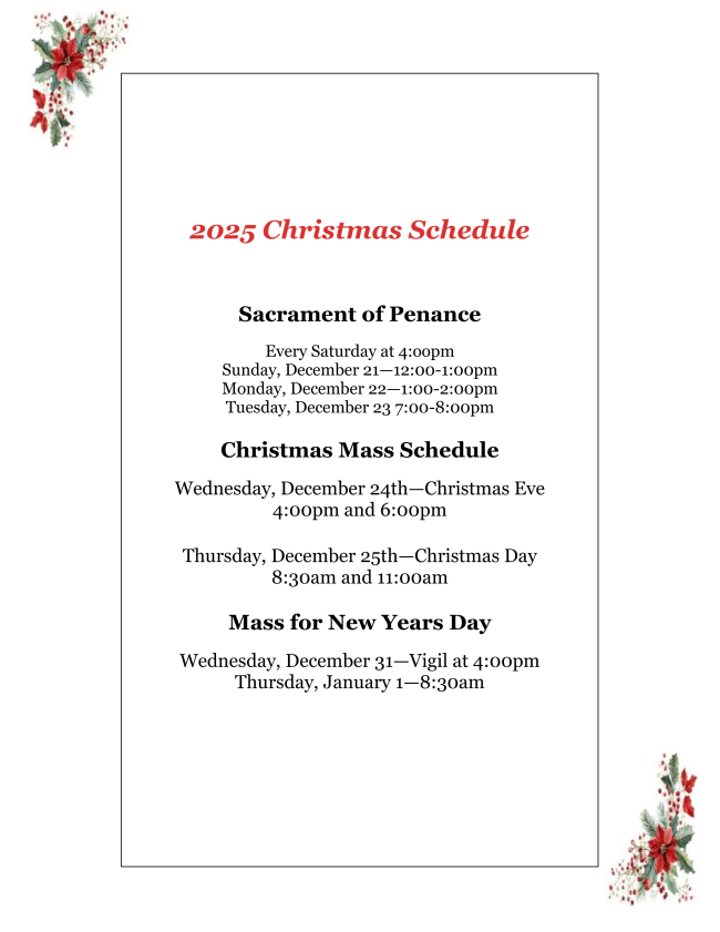 Confessions – Saturday 4:00pm – 4:45pm or schedule an appointment by calling the the parish office at 732-370-0500 ext. 204